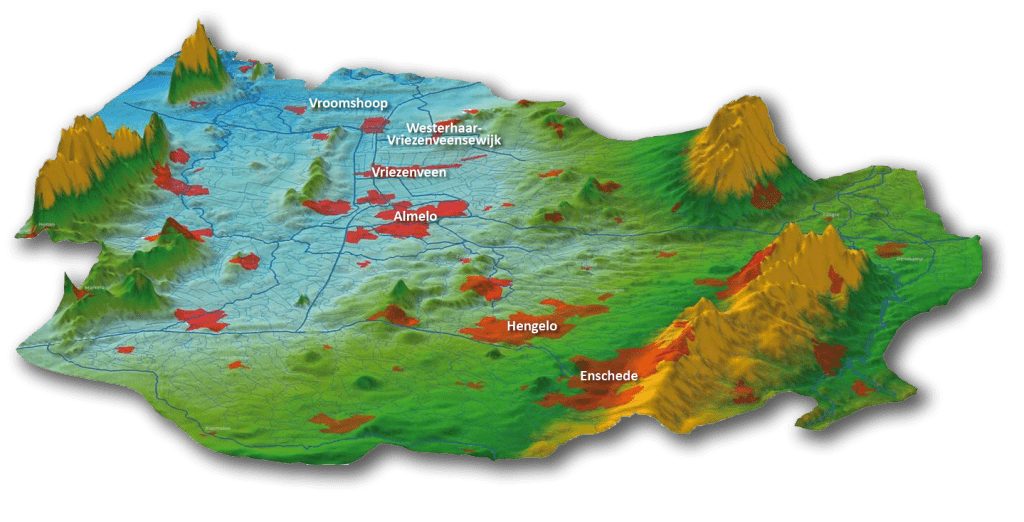 Hierboven zie je een hoogtekaart van Oost-Overijssel (de hoogteverschillen zijnĀ enigzins uitvergroot weergegeven). Het landschap is verre van vlak: links en rechts zijn heuvels en pieken te zien. Dat zijn de stuwwallen, die tijdens de voorlaatste ijstijd – zo’n 150.000 jaar geleden – zijn ontstaan.
