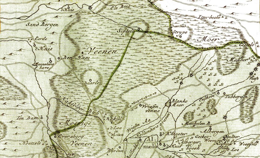 Dit is een kaart uit 1732, dus voor aanvang van de grootschalige vervening. Duidelijk is te zien wat de omvang van het veengebied in deze contreien was.
