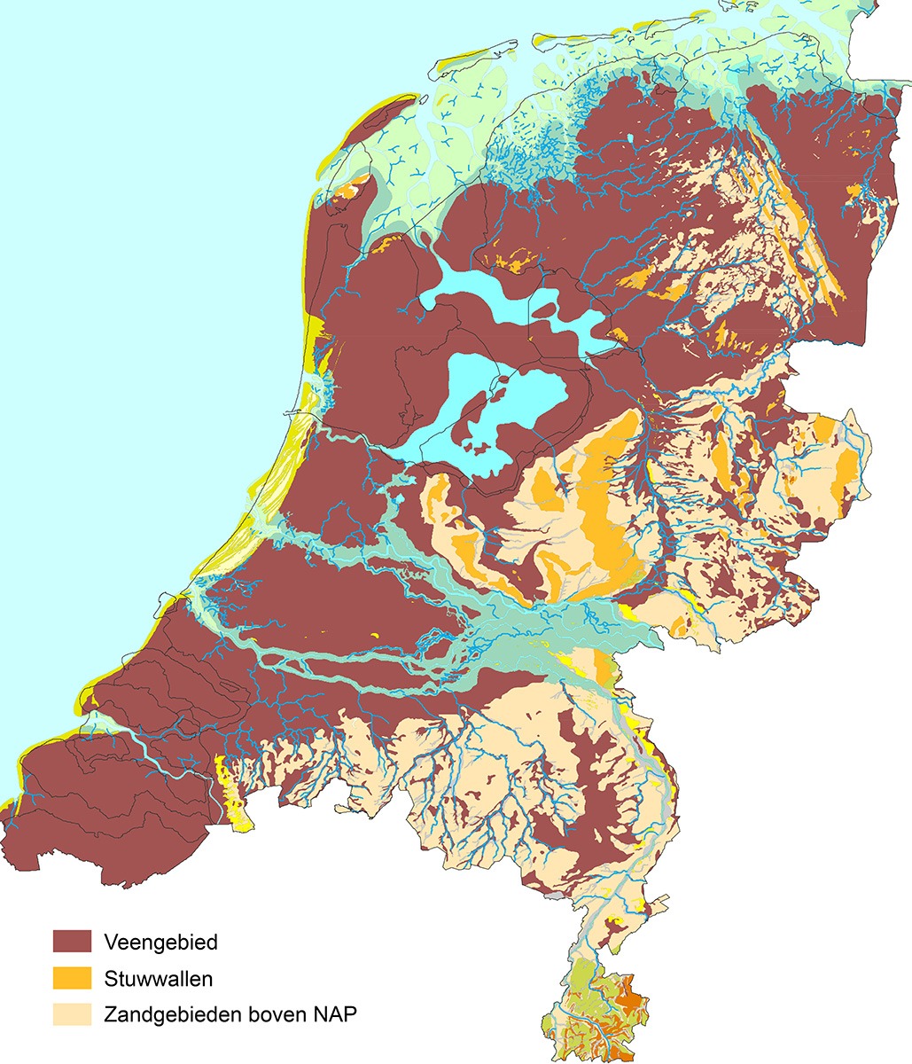 Dit is een kaart van de bodemsoorten van Nederland omstreeks het begin van de jaartelling. Hier is goed te zien hoe het grootste deel van Nederland bestond uit veengebieden, zowel laagveen als hoogveen, slechts onderbroken door de hoogten van de duinen in het westen, de stuwwallen in het noorden, midden en het oosten van Nederland en door het opgewaaide dekzand uit de periode na de laatste ijstijd.